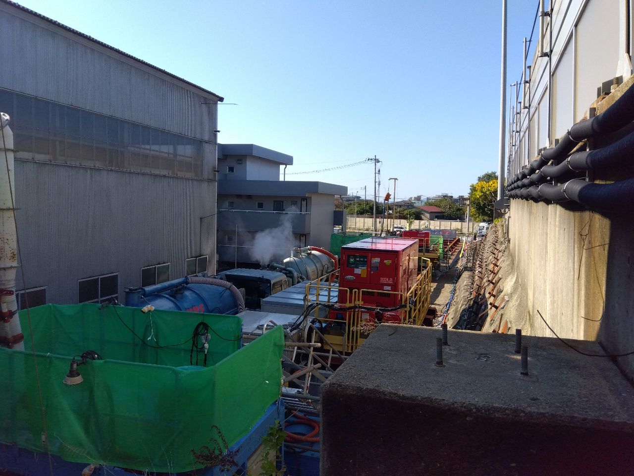 それでは、何をしているかというと 前回までご紹介した「鋼矢板(鉄の板)を地中に打ち込んで囲った内側の地盤を改良して固める作業」をしています('◇')ゞ