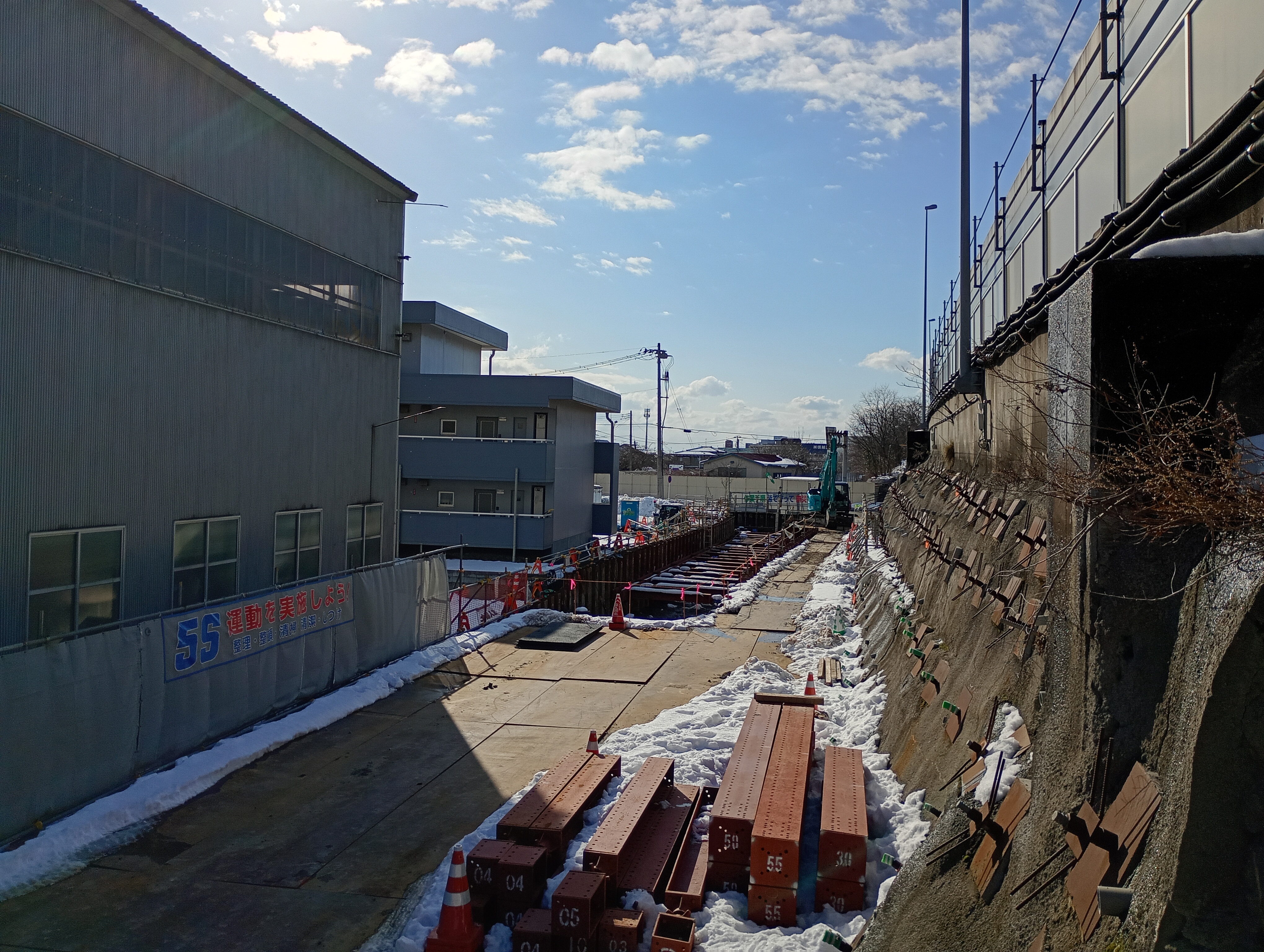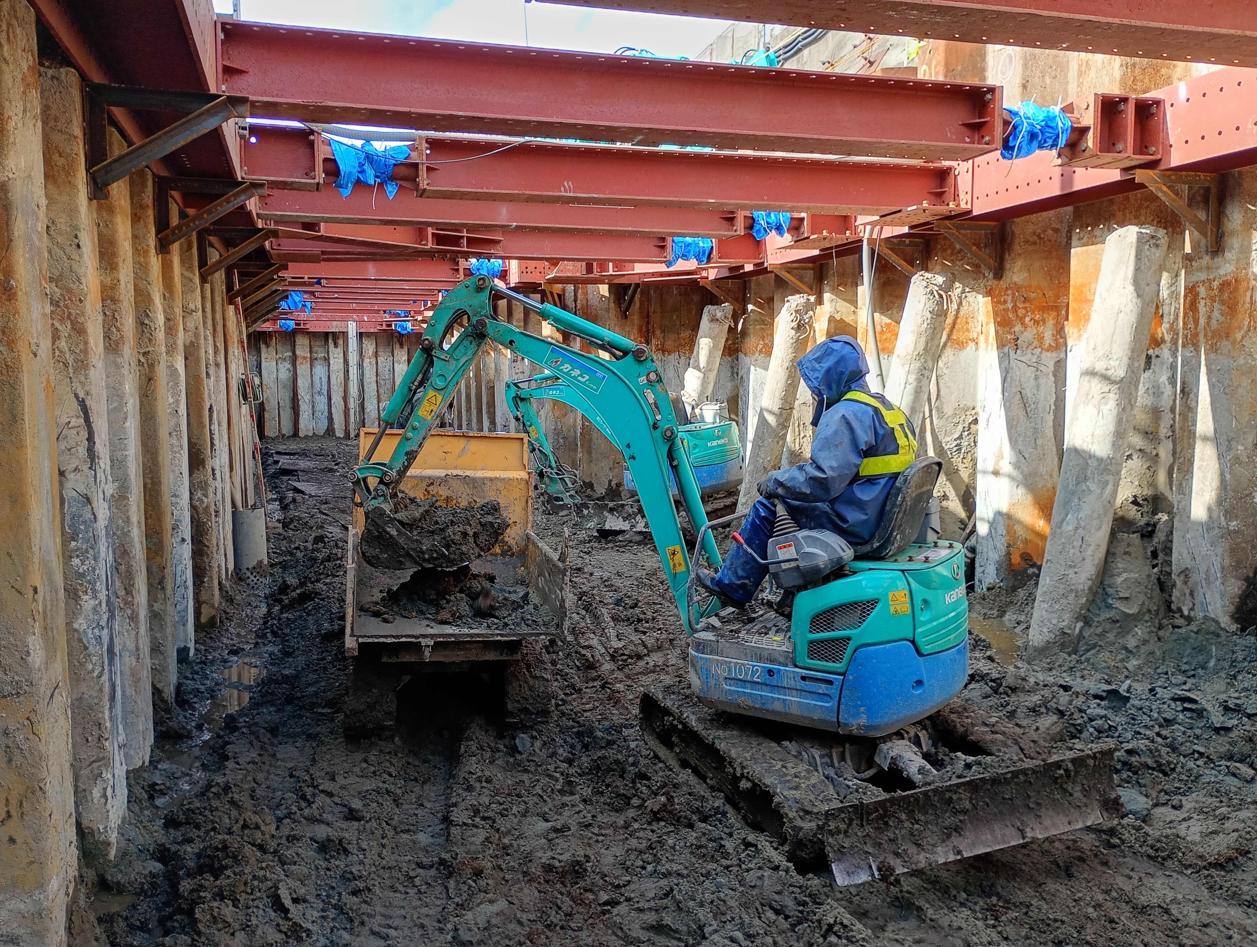 鋼矢板の内側にオレンジ色の鋼材が組んでありますが、これが「山留材」です。