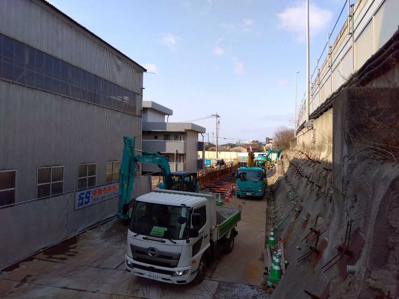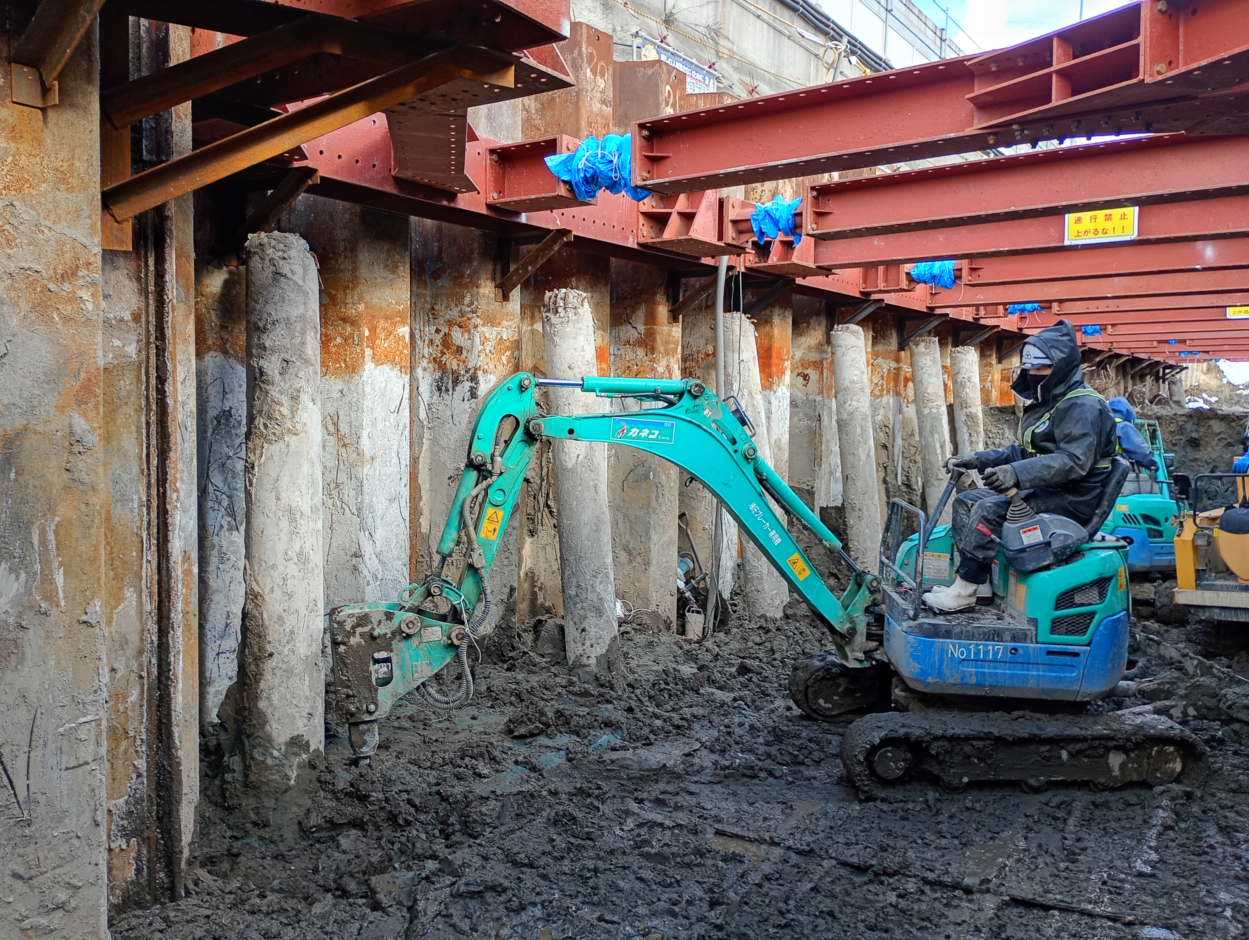 続いて、鋼矢板が内側に倒れてこないように、突っ張り棒のような役目をする山留材を設置して、内側の地面を掘りはじめました!!