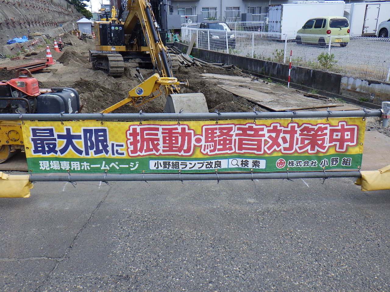 そして、今回の工事で私たちが最大限に取り組んでいる【振動・騒音対策】を皆さまにも知っていただきたくこの横断幕デザインにしました!